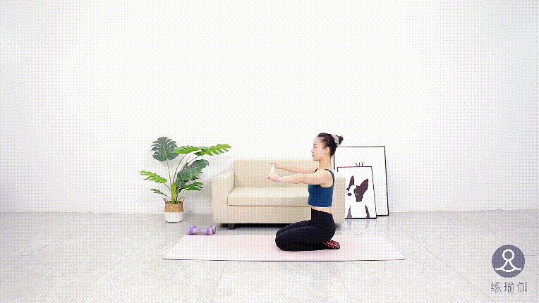 跪坐在瑜伽垫上,收肋骨向下,小腹微收,双手在体后抓一条伸展带,每次呼气时向两侧拉。动作重复20次。