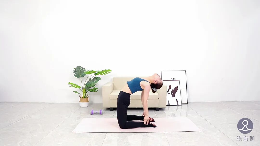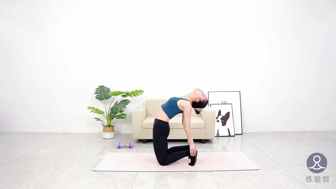 完成之后,跪立到垫子中间,将双脚打开骨盆同宽,双手扶在后腰,把大臂向内夹,呼气推髋,胸口向后向上延展,再依次将双手放在脚踝上方,充分伸展身体前侧的肌肉,停留五到十个呼吸。