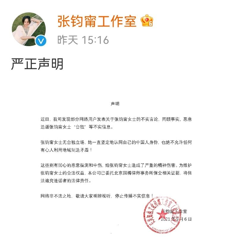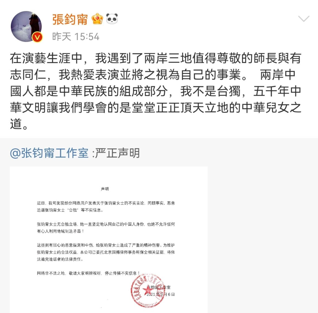 随后,张钧甯本人转发工作室微博并再次重申:我不是“台独”。