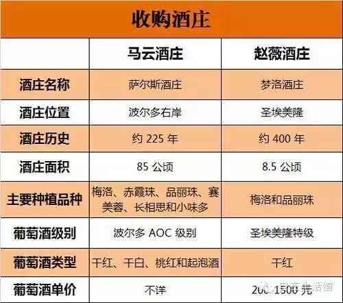 马云收购的萨尔斯酒庄(Chateau de Sours)位于波尔多右岸,距今有 200 多年历史,85 公顷面积,可产干红、干白、桃红及起泡酒等十余款酒。赵薇收购的梦洛酒庄(Chateau Monlot)位于波尔多右岸圣埃美隆产区,距今有 400 多年历史,8.5 公顷面积,只产干红葡萄酒。酒庄。