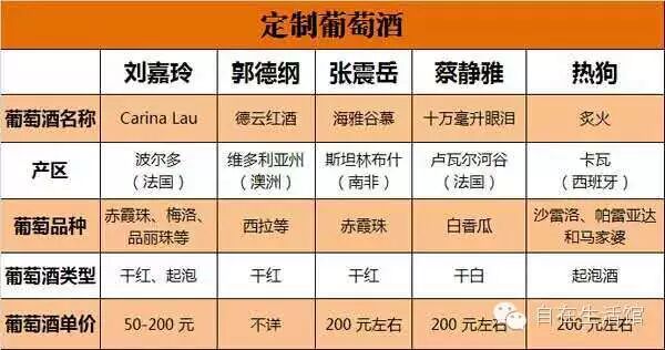 2015 年,刘嘉玲宣布与波尔多酒商合作推出个人品牌葡萄酒 “Carina Lau”,主要走亲民大众路线。郭德纲与澳洲维多利亚杜利德酒庄(Mt Duneed Estate)合作推出个人品牌葡萄酒 “德云红酒(DEYUN)”。张震岳、蔡健雅和热狗共同推出音乐人葡萄酒计划(MWP),分别定制推出 3 款葡萄酒:南非海雅谷慕南非特调干红葡萄酒、法国卢瓦尔河谷十万毫升眼泪干白葡萄酒和西班牙热狗炙火卡瓦气泡葡萄酒。