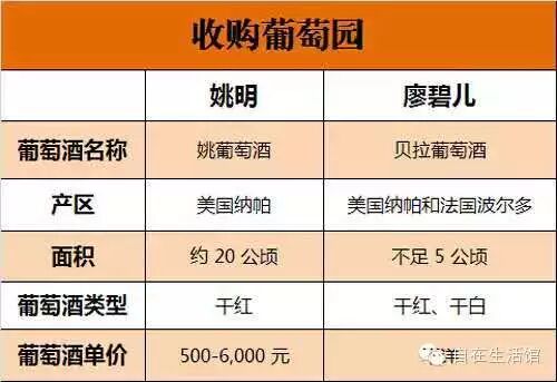 2011 年,姚明成立姚家族葡萄酒公司,收购美国纳帕谷(Napa Valley)的几个葡萄园的葡萄酿造葡萄酒。香港影星廖碧儿在纳帕谷及波尔多买下 2 个葡萄园,自己酿造葡萄酒。