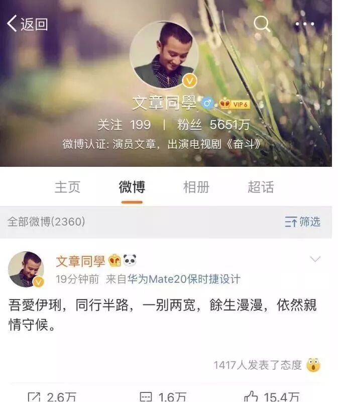 文章发文称:吾爱伊琍,同行半路,一别两宽,余生漫漫,依然亲情守候。