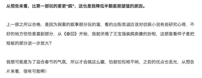 《唐1》的成功是来自于一种“融合的分寸感”,既没有很癫,又没有在推理上绕的那么玄乎,陈思诚的聪明体现在这种分寸感的把握,我当时给《唐1》打了7.5分。