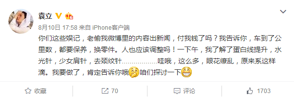 发完微博被网友喷了,说她不该揭露这些事情,她又继续发了条,把人比作汽车,说自己也到了改换机油的时候了,还一下午补习了好多医美知识呢。