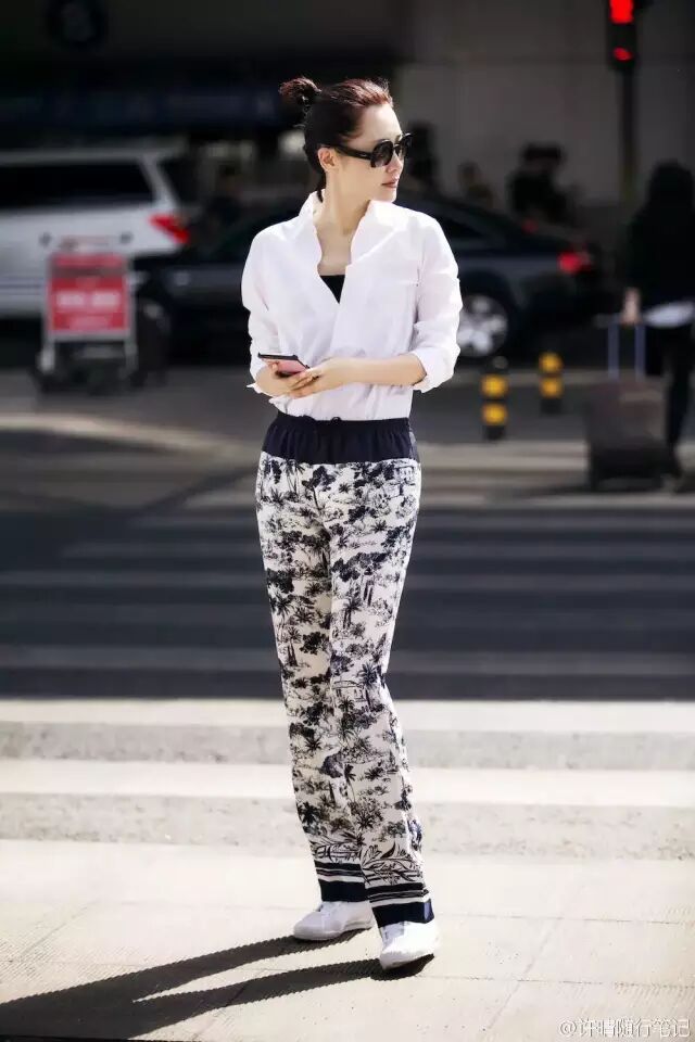 白衬衫搭配印花裤是个不错的选择!休闲又得体。▼