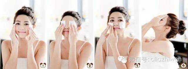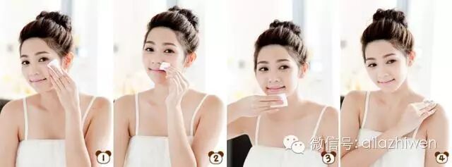 1:充分浸湿的化妆棉在肌肤上拍压涂擦