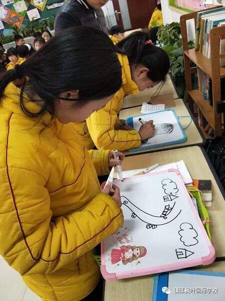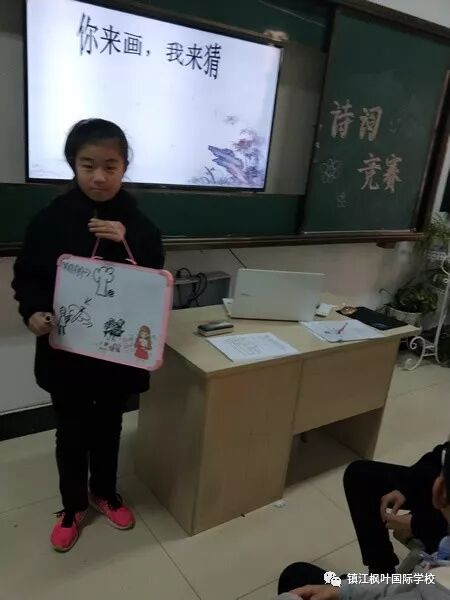 比赛中,采用赛前抽签决定各小组人员及试题号码,现场打开试题,进行答题,必答题结束后,再进行抢答,抢答题可以场外求助。孩子们在体验了比赛激烈的同时更感受到团队精神,学会合作。尤其是“你来画,我来猜”这一环节中,我们的同学现场在画板上画出诗句的意思,各小组猜诗题,并且背诵诗句。孩子们画得专注,同学们猜得投入,就连台下的同学们也是热情高涨,不仅赞叹猜题者的机智,更佩服绘画者的意会技能。