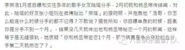 至于李荣浩成名之前的绯闻,也是多多。小编也听说过很多,由于真实性不可确定,小编就不爆料了。但是公开的新闻,李荣浩前女友陆瑶爆料:李荣浩在跟前女友分手没几天就去追杨丞琳。但李荣浩却声称分手好几个月了。