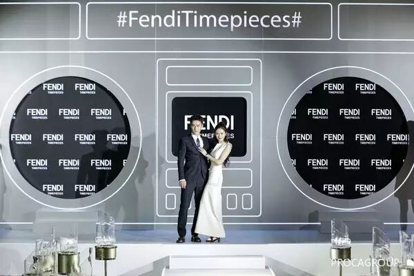 蒋劲夫身着FENDI 2016春夏系列条纹印花西装,佩戴Momento Fendi Bugs男士腕表,张天爱身着FENDI 2016春夏白色立体剪裁连衣裙,佩戴Momento Fendi Bugs系列全新女士腕表