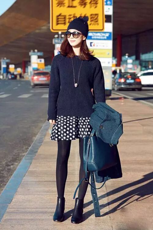 刘诗诗纽约时装周机场街拍,深蓝色毛衣和黑白格子短裙、短靴的搭配简洁清新,展现诗爷活泼俏皮的一面。