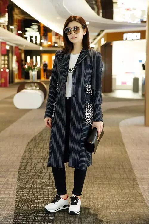 陈妍希和上面两位女神比起来,颜值稍逊一筹,不过近两年衣品也算提升不少,机场look,用竖条纹中长外套配白T恤和黑色紧身裤、白色运动鞋,简约利落,展现帅气休闲的一面。