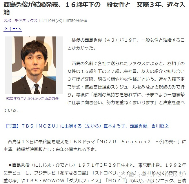 【星闻】西島秀俊将与小16岁的女性结婚 东瀛音悦Tai 日韩男星 2014-11-19 18:23:16 451 创作不易,用心坚持,欢迎请BaGua喝几杯爱心咖啡!打赏并支持本文 打赏并删除本文 据日网新闻报道,西島秀俊将与比他年下16岁的女性结婚。对方是27岁的前公司职员,性格开朗稳重,两人经友人介绍相识,已交往3年,计划于近期内提交结婚申请书。西島秀俊表示:自 己不会忘记对大家的感谢之情,今后在工作上也会进一步努力。又一位男神要结婚了,新娘不是小东瀛(你滚开! 创作不易,用心坚持,欢迎请BaGua喝几杯爱心咖啡!打赏并支持本文 打赏并删除本文 感谢您的支持鼓励,我会继续努力的!文章地址:用户邮箱:打赏金额:USDT 请输入数字点击”去打赏“,即可进行打赏支持本文章哦 About the Author 东瀛音悦Tai 功能介绍:音悦Tai日本音乐频道 官方认证:北京宽客网络技术有限公司 Related Posts 坂口宪二无期限休止艺能活动,《医龙》第五季怕是盼不来了吧. 2018-04-02 17:06:16 【MUSIC STATION ウルトラFES 2017】演唱曲目公开! 2017-09-15 17:46:19 【长瀬智也*神谷浩史】天呐,次元壁又裂了! 2017-07-04 17:55:44 【稻垣吾郎、草剪刚、香取慎吾】合约期过后退出杰尼斯事务所! 2017-06-19 17:25:06 【相叶雅纪】侦探大人,可否一起喝杯红茶~ 2017-03-17 17:55:13 发表评论
