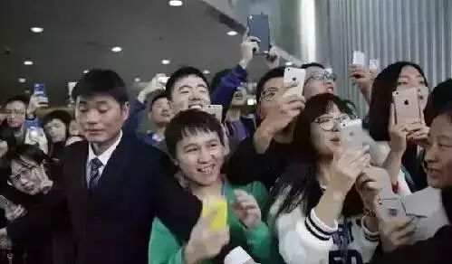 只有保安大叔一脸淡定,用手臂挡着几近沸腾的人们……