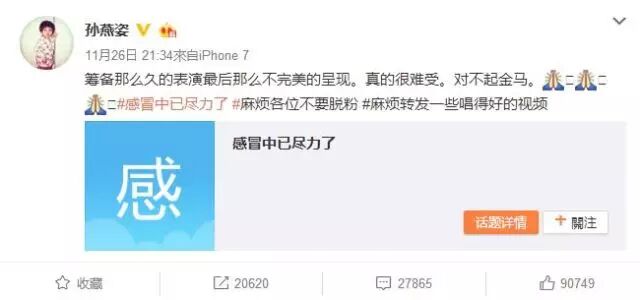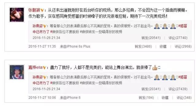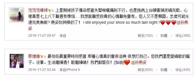 孙燕姿的粉丝纷纷留言表示理解支持,感冒是难以避免的事,“这么多年了,你的实力无需证明,一次不完美不要放在心上!”“燕姿不要自责,谢谢你昨晚的用心演出,爱你!”粉丝们叮嘱孙燕姿好好养病,快点好起来。