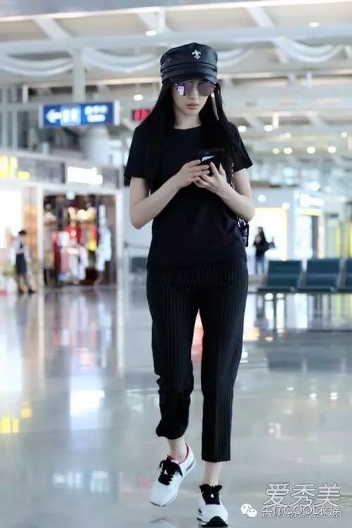 张天爱穿黑色T恤配黑色九分裤,脚踩小白鞋,戴着时髦帅气的帽子,利落帅酷,黑色显得她更加纤瘦了。