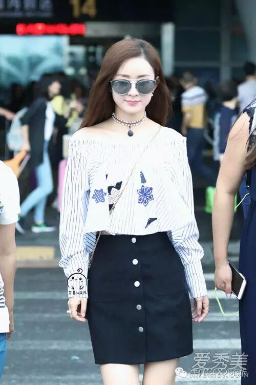 赵丽颖穿一字领的竖条纹上衣配黑色高腰短裙,今年很流行的穿法,甜美不失小性感,与她的气质完美契合。