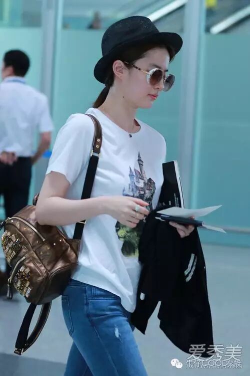 刘亦菲穿白T恤配牛仔裤简单大方,夏天最经典的搭配,满满的少女活力,加一顶帽子更时尚,包包也很个性。