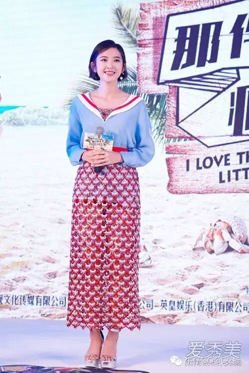 唐艺昕用浅蓝色上衣配红色网眼长裙,上衣采用经典的水手服翻领设计,甜美减龄,透视长裙时尚又性感,整个人看着愈发娇俏诱人呢。