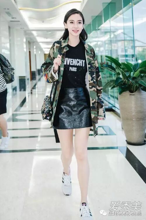 Angelababy最新造型,迷彩外套配黑色T恤和小皮裙,脚踩小白鞋,青春帅气。夏天也要备一件时髦轻薄的外套,待在冷气房或者赶飞机的时候,就能应对温差了。