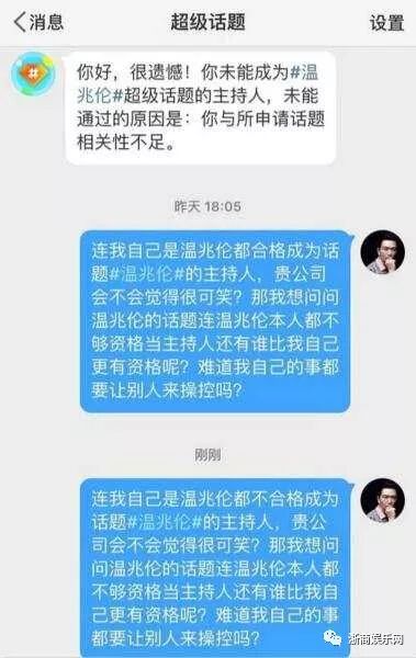 1月29日凌晨,温兆伦在网上晒出一组和微博管理员的对话截图。微博管理员表示温兆伦申请自己话题的主持人失败,原因是与话题相关性不足。温兆伦怒怼:“连我自己是温兆伦都不合格成为话题主持人,贵公司会不会觉得很可笑,那我想问温兆伦话题连温兆伦本人都不够资格当主持人,还有谁比我自己更有资格?难道我自己的事都要让别人操控么?”