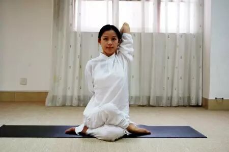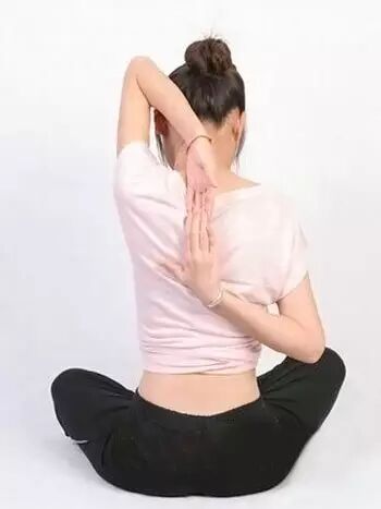 做法:在地上跪立左腿向前抬起,把小腿放在右小腿的外侧,坐在两腿中间的地面上,吸气,左手从上往下右手从下往上从背后巷口,挺胸,深呼吸4次,换另一侧重复同样动作。