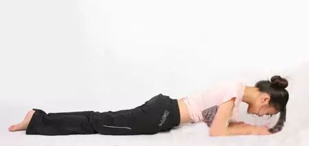 做法:双手握紧十指交叉俯卧,肘关节和小臂外侧触地,吸气,然后脚趾踩地,让身体抬离地面,让腿和身体成直线,保持这个动作做4次呼吸,重复练习两次。