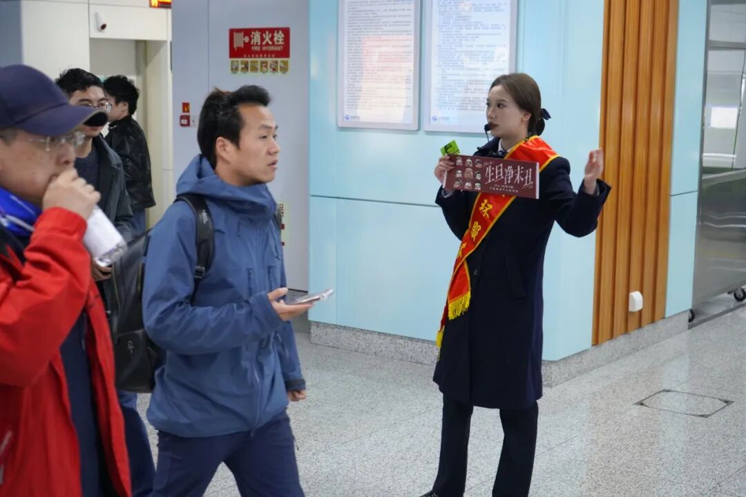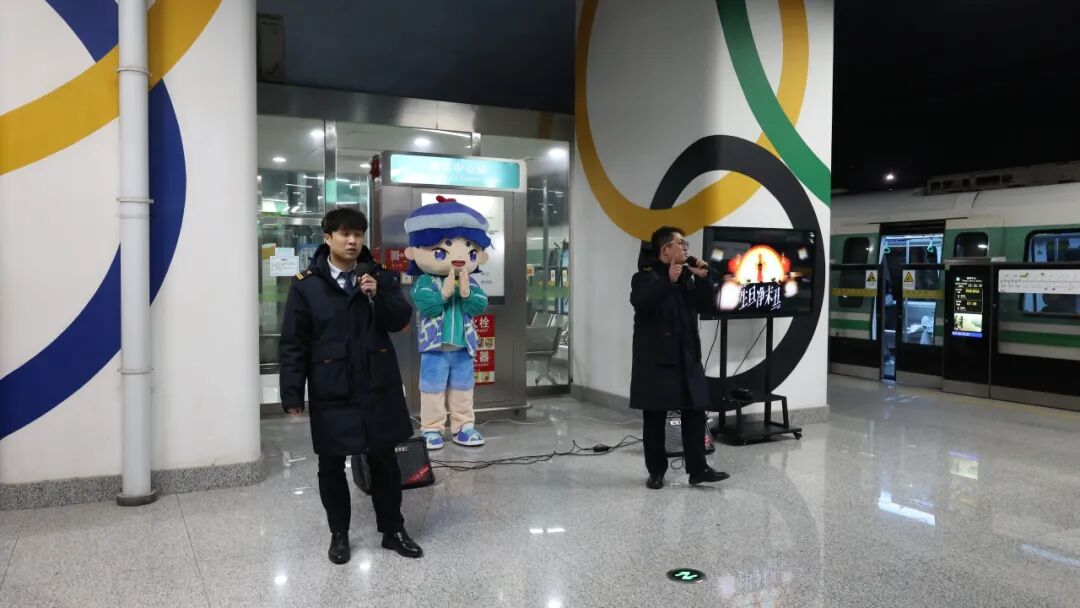 令人惊喜的是,站台内一场“绿动心弦·小春之声”音乐快闪活动热闹上演。地铁五环服务队工作人员手持话筒激情开麦,带领乘客合唱《生旦净末丑》等经典曲目,江北新时代文明实践代言人“江小北”在旁引导氛围,让等候列车的时光充满欢声笑语。
