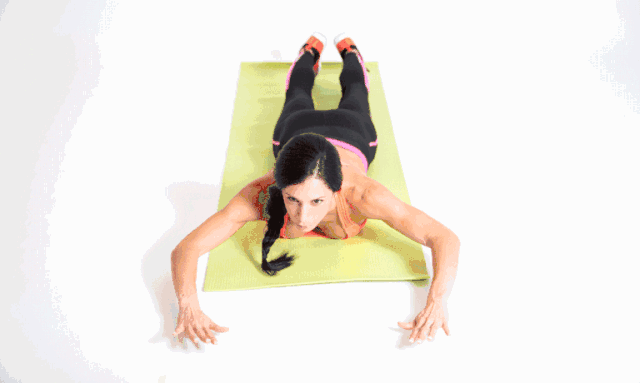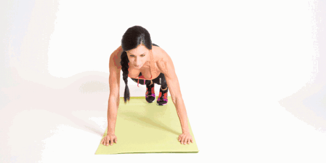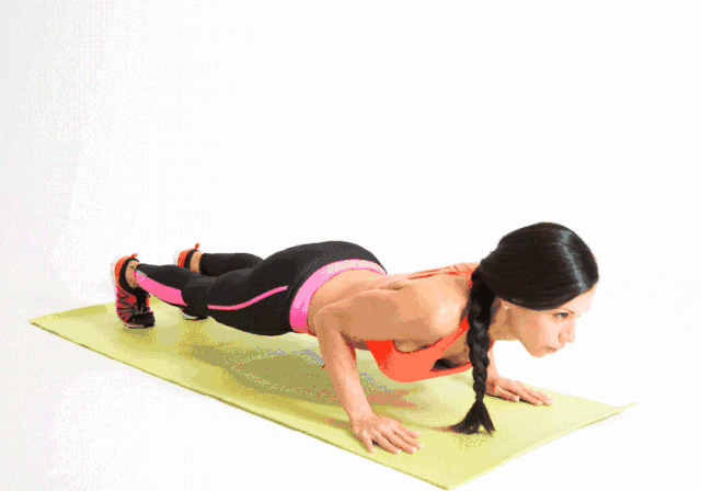 ◎做法:来到平板式,双手掌分开在肩部的下方,双脚的前脚掌压实在垫子上,然后左右手交替碰对侧肩膀,然后弯曲双手肘夹向身体,躯干向前向下,如果不能曲肘,可以膝盖落地,做简易版。这样是一组,重复做10组。