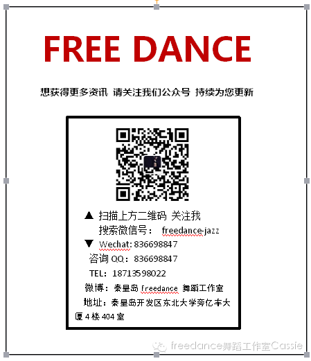 free dance 舞蹈工作室主要课程开设:jazz日常、jazz晚班、mv日韩舞台舞蹈 ;;2015年暑期班火热招生中;;电话18713598022;;地址:秦皇岛开发区东北大学对面美玲小区5栋一单元101室