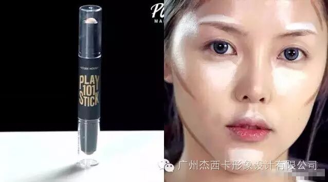 用Etude House 101雙頭修容棒的陰影部分塗在顴骨、下巴線、髮際線,再用高光部分眼睛下方、上唇線、下巴以及眉毛上方。然後用海綿暈開。