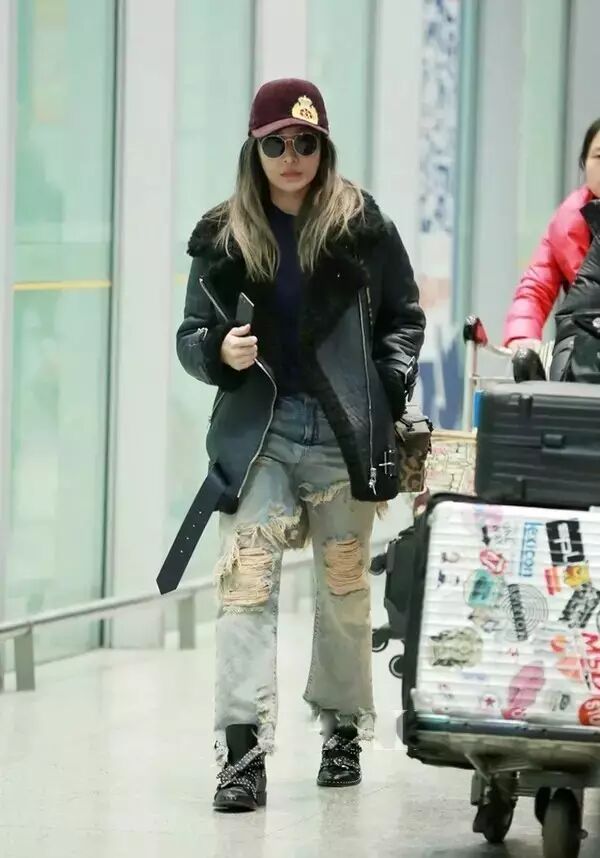 茜妞的机场look,她选的是Vetements x Champion联名系列红黑撞色卫衣。