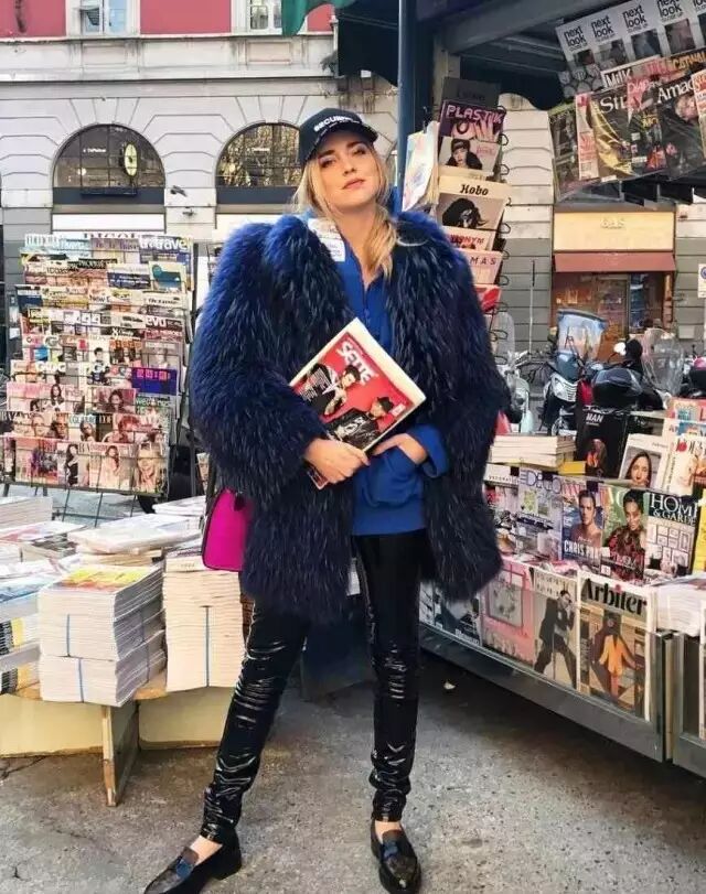 宇宙第一时尚博主嘉拉·法拉格尼 (Chiara Ferragni)穿了一件蓝色露肩卫衣,搭配紧身皮裤与乐福鞋,个性十足。