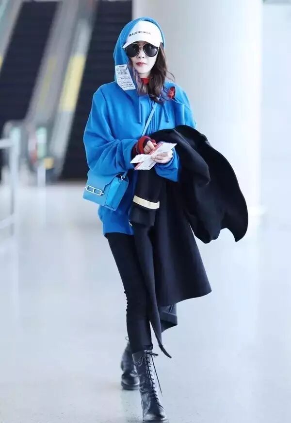 Vetements x Champion联名系列的个性卫衣,杨幂挑了件更为抢眼的蓝色款,用利落的黑色紧身裤与绑带靴修饰体型强调细腿,随性凸显帅气!