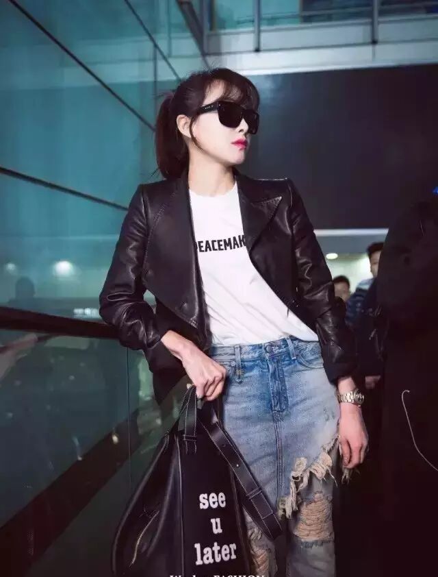 肯豆也穿过这件,搭配黑色皮革喇叭裤,脚踩小白鞋,好身材一览无遗。