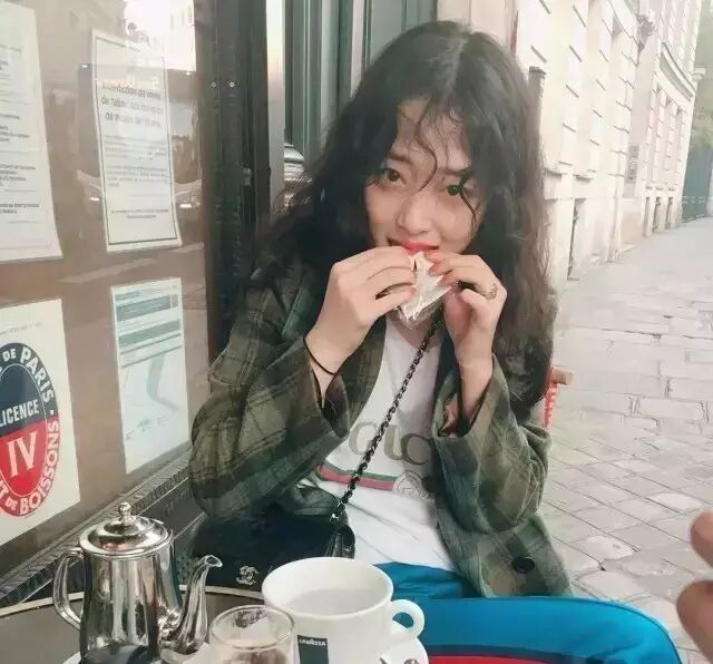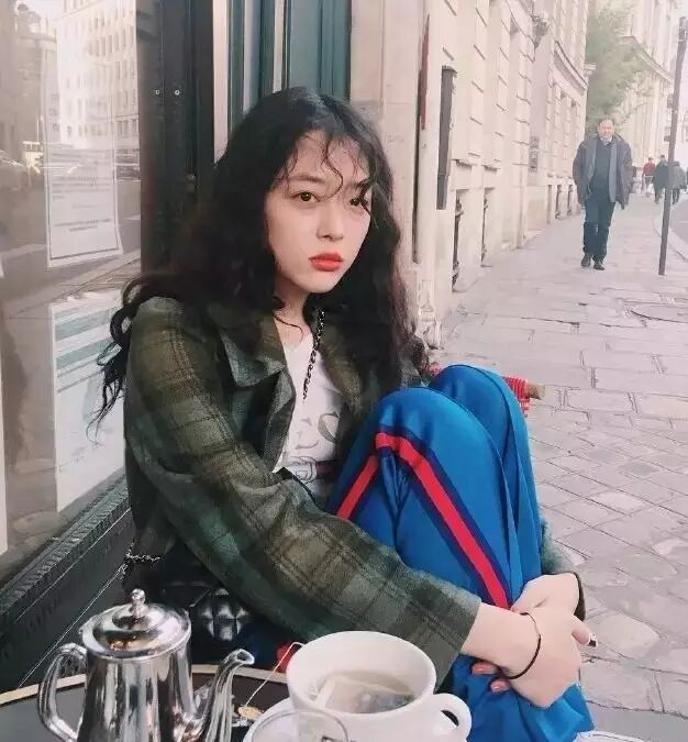 最近在韩国大火的雪莉也穿了这件T,配Lucky Chouette格子大衣,下身搭配蓝色“校服裤”。