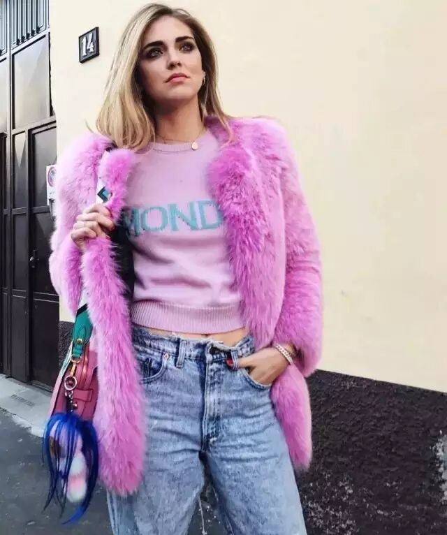 宇博Chiara Ferragni穿的是紫色的星期一。