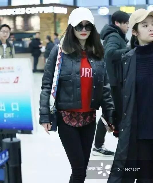 大幂幂穿了红色的星期四,也是与衬衫叠穿打造层次感,外面搭配皮夹克酷帅有型。