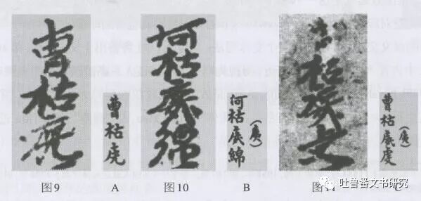 在一件大约6世纪记录进入吐鲁番地区的四十余个胡人名姓的汉文文书《曹莫门陀名籍》(《吐鲁番出土文书》壹,第359页)中,有三个名字都是“枯+ X”构成,待考字均从广(图9,10, 11 ),整理者隶定为A、B、C,读作曹枯、何枯