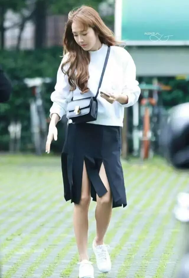 搭配开叉裙也是一个不错的选择,比较灵动特别,Jessica就是纯色白色卫衣+开衩黑色半裙,照样很耐看。