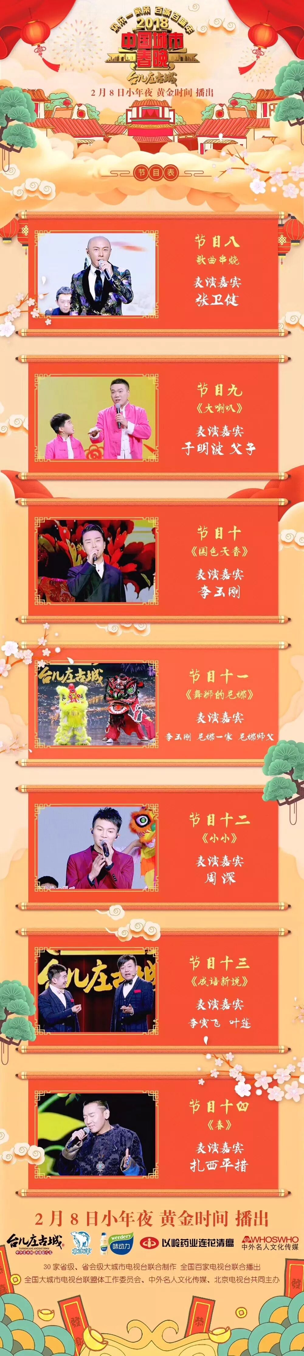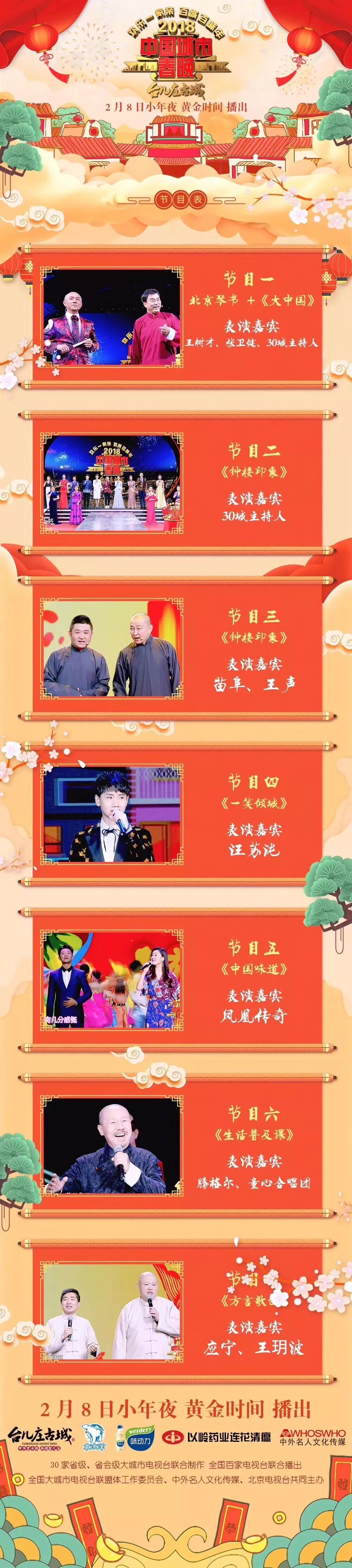 张卫健,徐春妮,孔洁,方琼等将会以主持人的形象与25城主持人共同亮相春晚。以“欢乐一家亲百城百味年”为主题的2018中国城市春晚,由“台儿庄古城”独家冠名,由“北冰洋果汁汽水”特约播映,并由“肠胃有活力,人生有动力”的味动力乳酸菌指定饮品大力支持。