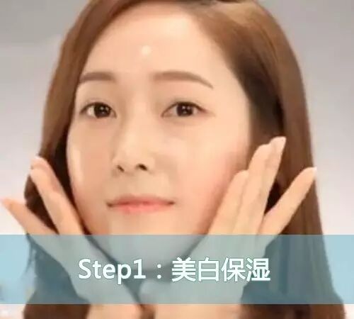 Step1:洁面后,涂上美白霜是肌肤水润光泽。双手按摩脸部,使皮肤充分吸收