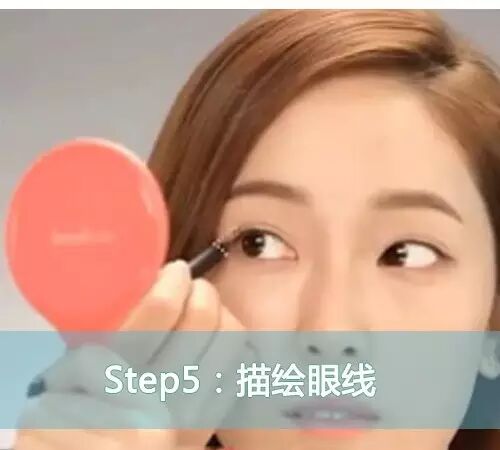 Step5:画眼线,沿着内眼睑画上一条细细的眼线,在眼尾处稍微延长