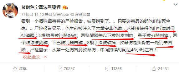 还有人分享过一个真实案例,一位被毒枭抓住的缉毒警察的尸检报告,显示: