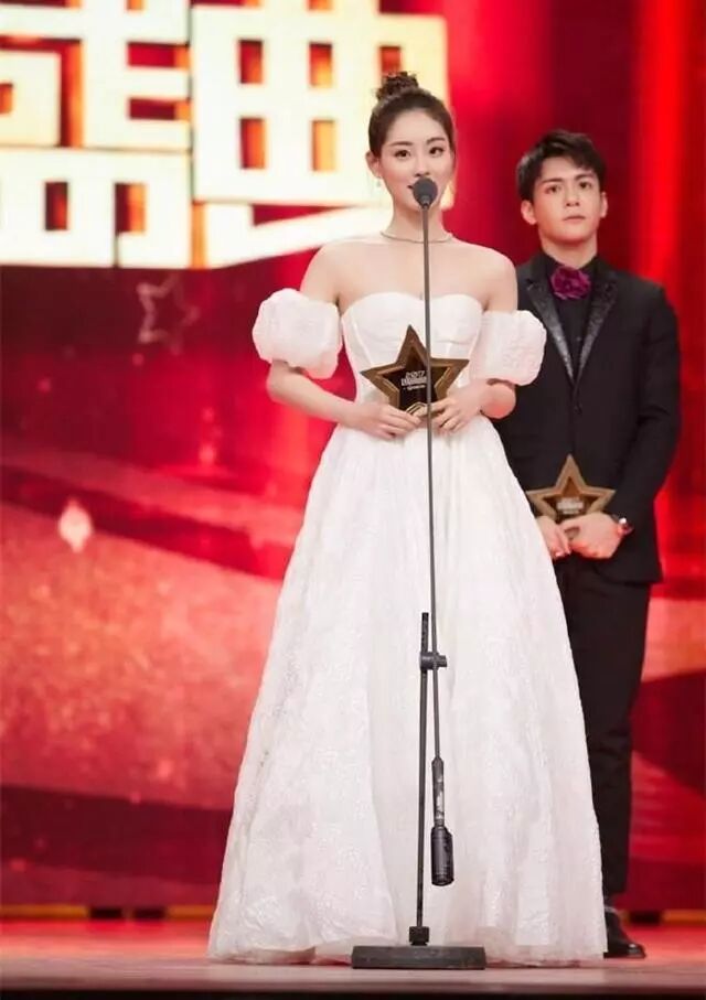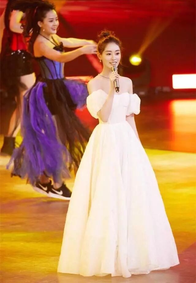 出席某颁奖活动的祝绪丹扎着可爱的丸子头,脖子上戴着一条珍珠项链彰显气质,身穿一件白色抹胸长裙娇嫩可人。