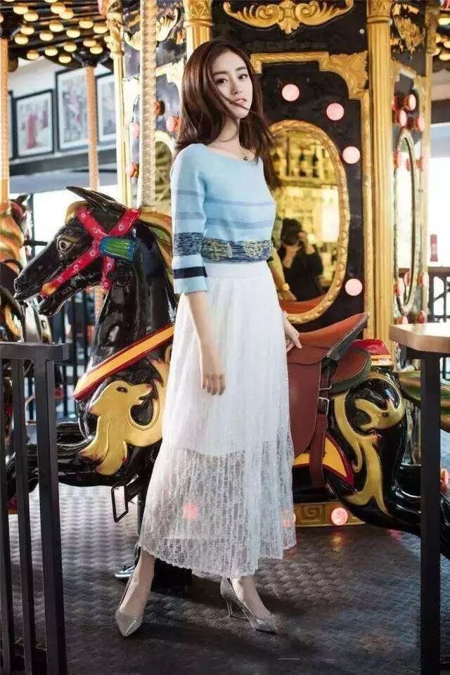 长发飘飘尽显温婉柔美的气质,祝绪丹身穿蓝色条纹圆领毛衣显得温柔十足,下身穿着白色蕾丝长裙搭配裸色尖头高跟鞋唯美飘逸。