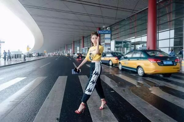 机场中的祝绪丹身穿黄色印花T恤简单舒适,下身穿着黑色长裤休闲十足,脚踩一双红色高跟凉鞋精致时尚。