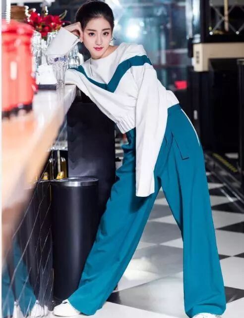 白色印花套头毛衣清新十足,下身穿着蓝色阔腿长裤简单休闲不失时尚气息,脚踩一双白色运动鞋经典百搭。