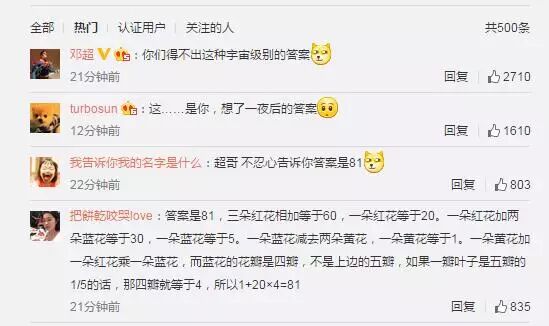 有网友在微博下评论,把正确答案和解释贴给了邓超:“答案是81,三朵红花相加等于60,一朵红花等于20。一朵红花加两朵蓝花等于30,一朵蓝花等于5。一朵蓝花减去两朵黄花,一朵黄花等于1。一朵黄花加一朵红花乘一朵蓝花,而蓝花的花瓣是四瓣,不是上边的五瓣,如果一瓣叶子是五瓣的1/5的话,那四瓣就等于4,所以1+20×4=81”。