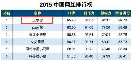 王思聪傲居网红榜的第一位,奶茶妹妹第十位